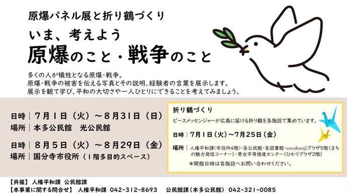 令和7年7月1日(火曜日)から8月31日(日曜日)にかけて、市内公共施設において「原爆パネル展」を開催し、原爆・戦争の被害を伝える写真や経験者の言葉を展示しました。